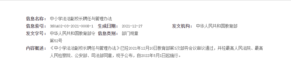 《中小学法治副校长聘任与管理办法》已经2021年12月10日教育部第3次部务会议审议通过,并经最高人民法院、最高人民检察院、公安部、司法部同意,现予公布,自2022年5月1日起施行。