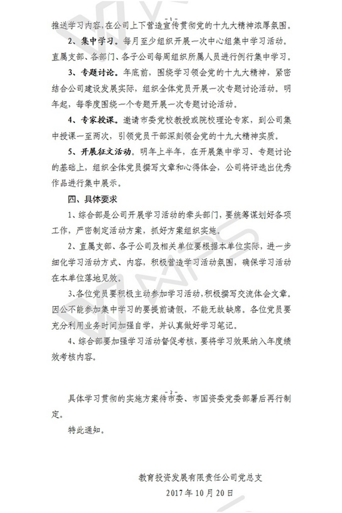教投公司党总支以实际行动将学习贯彻十九大精神引向深入