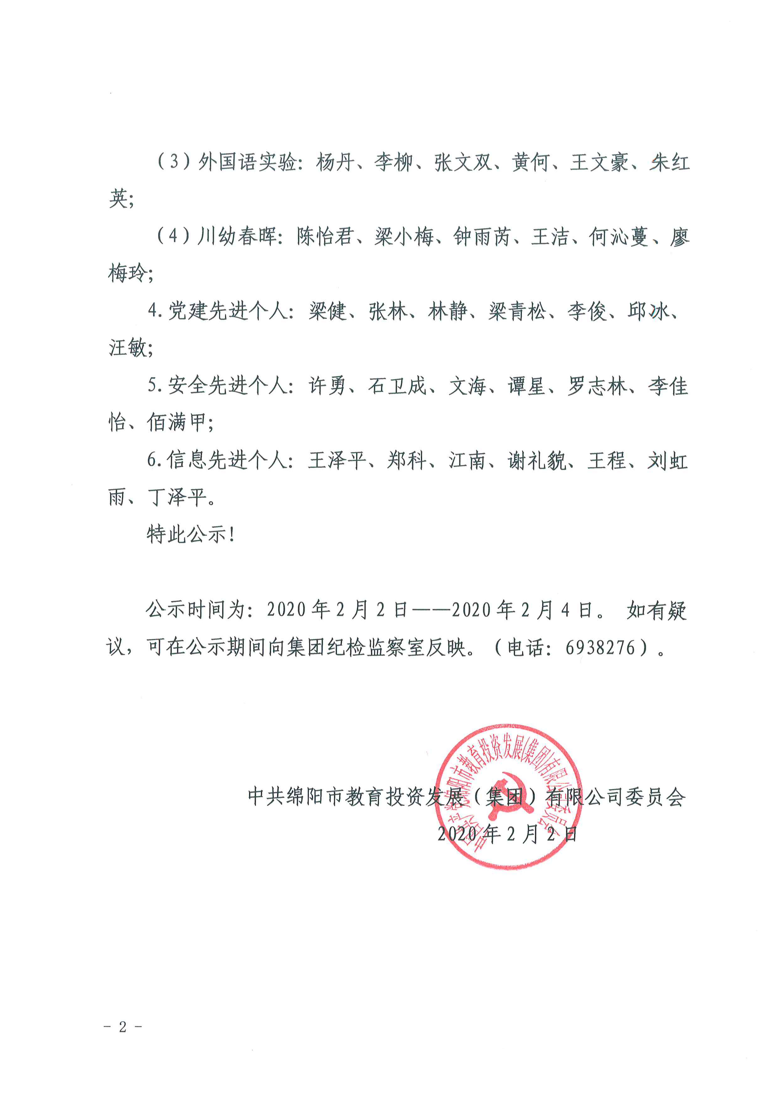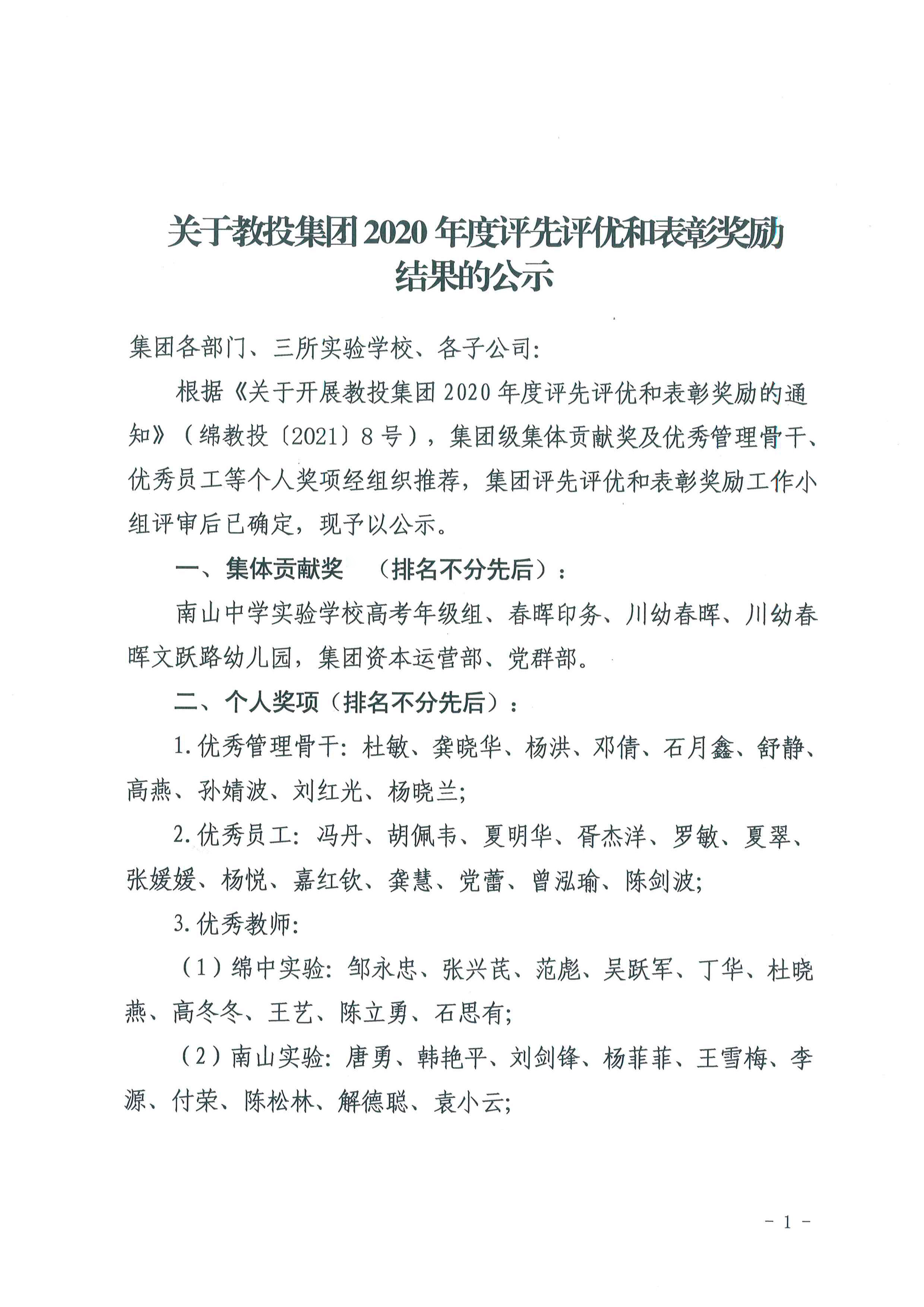 关于教投集团2020年度评先评优和表彰奖励结果的公示