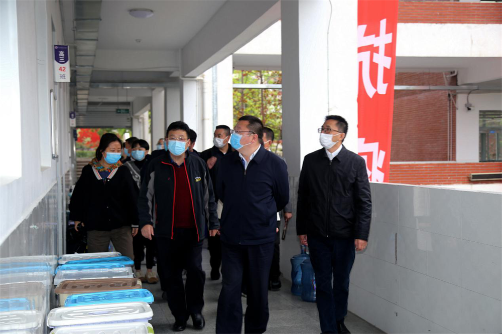 在观看了学校防疫宣传外围布置内容,并详细听取了学校关于学生复学工作的前期准备情况、后期系列学生管理制度和应急情况处置方案的汇报后,元方市长一行实地参观了学校高三教学区域,现场了解高三年级学生复学后教育教学工作开展情况和学生学习状态。激情洋溢的授课教师,全神贯注的学生,良好的课堂纪律,浓厚的学习氛围,得到了元方市长一行的一致好评。元方市长强调,学校要高度关注学生在复学后的学习效果、行为表现和心理变化,进一步细化各类学生管理制度,加强学生防疫期自我防护教育和生命安全教育,强化培训学生出现突发事件时的规范处理办法。教师要精研高考变化趋势,科学规划复习进度和授课模式,加强学生在防疫期的情绪引导和心理干预,确保学生实现防疫学习两不误。同时,要继续扎实开展防疫知识宣传、严密组织防控应急演练,全面提升师生防控意识和能力,筑牢师生安全“防护墙”。