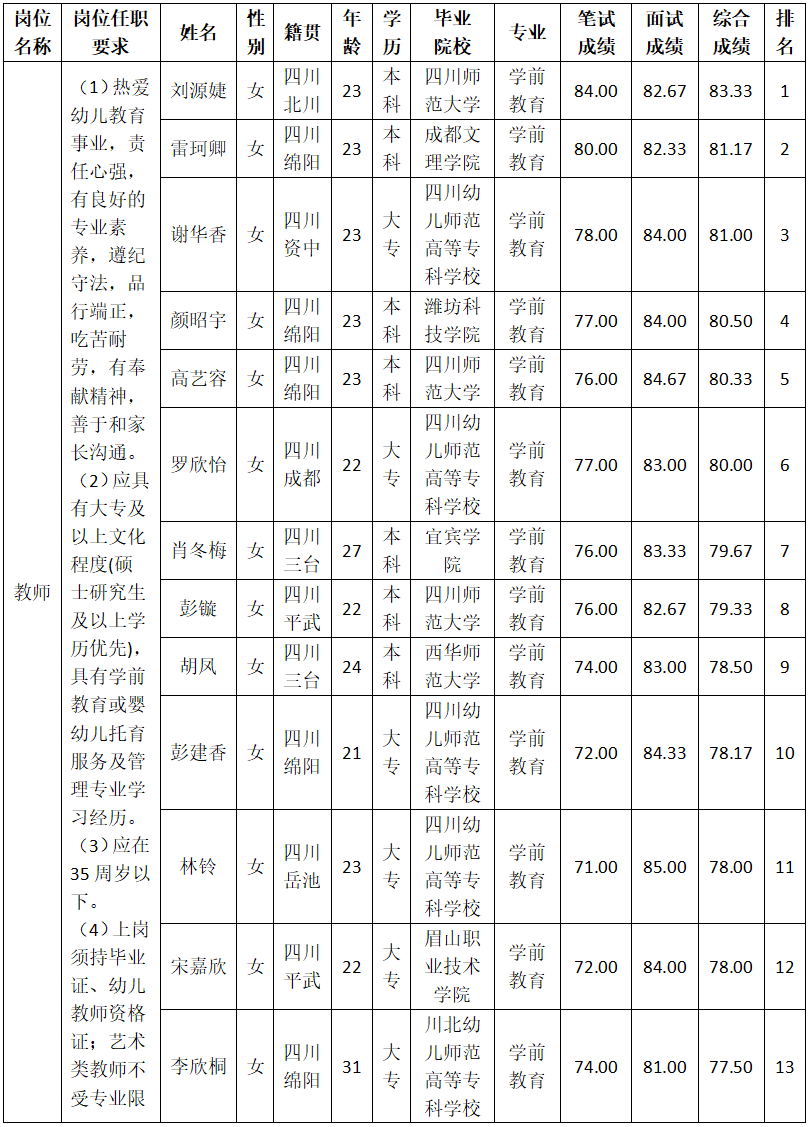 绵阳春晖教育管理有限公司关于招聘保育、保安 岗位测试成绩的公示(第四批)