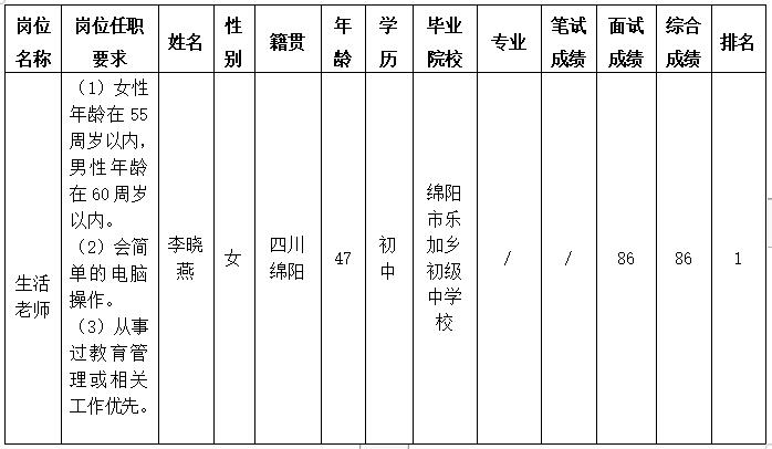 绵阳中学实验学校关于招聘生活老师岗位 测试成绩的公示(第五批)