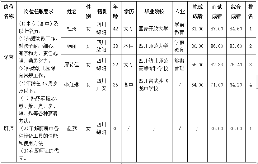 绵阳春晖教育管理有限公司关于招聘保育、保安 岗位测试成绩的公示(第四批)