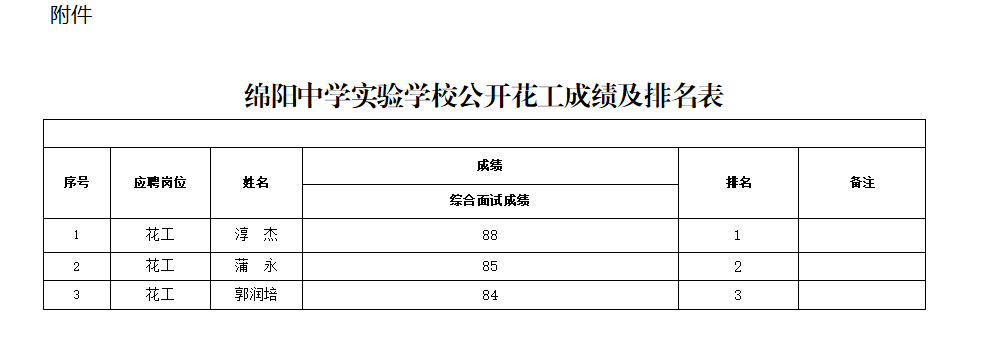 绵阳中学实验学校公开招聘花工成绩及排名公示