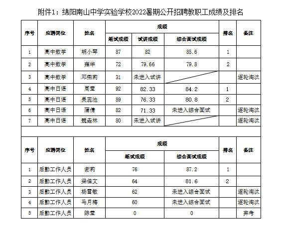 附件:绵阳南山中学实验学校2022年暑期公开招聘教职工成绩及排名