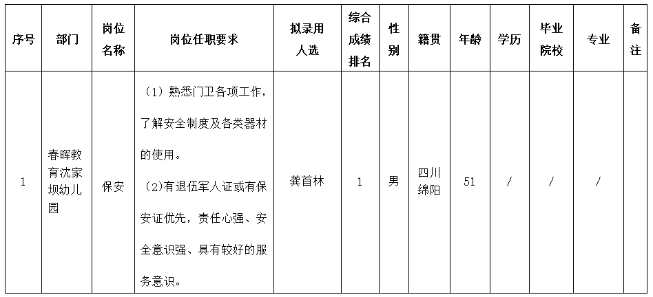 绵阳春晖教育管理有限公司关于招聘保安岗位拟录用人员的公示(第六批)