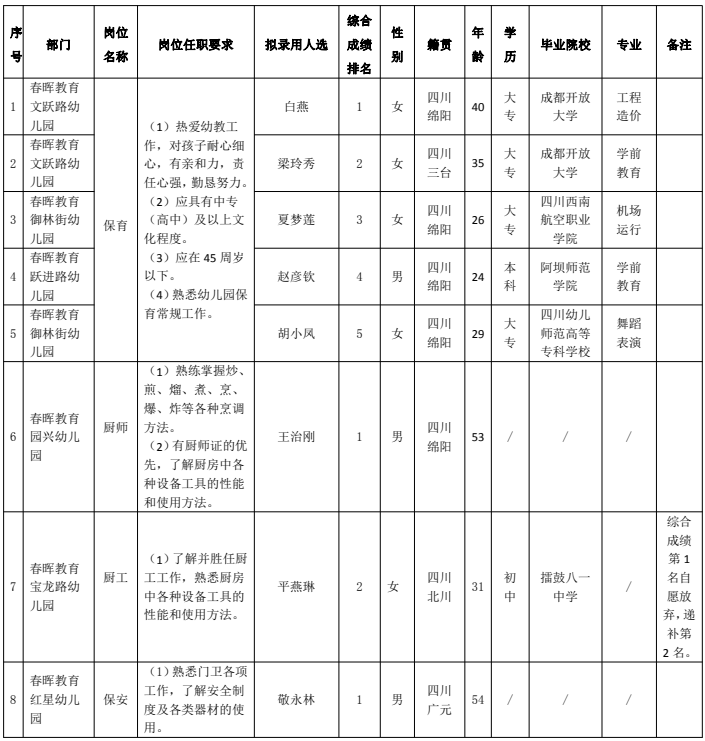绵阳春晖教育管理有限公司关于招聘保育、保安岗位拟录用人员的公示(第四批)