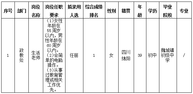 绵阳中学实验学校关于招聘生活老师岗位拟录用人员的公示(第三批)