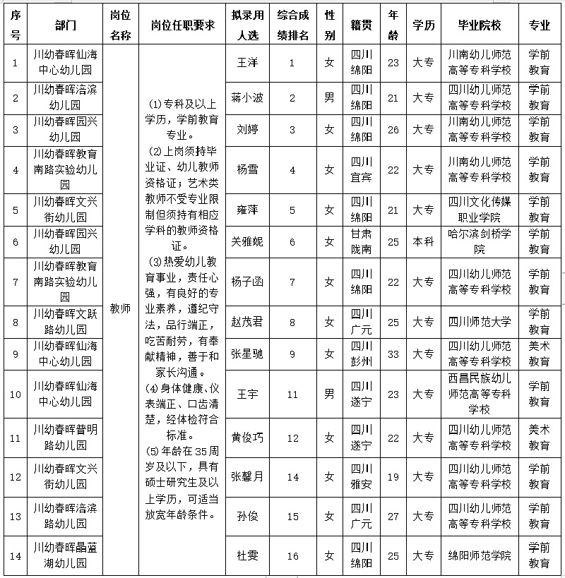 四川川幼春晖学前教育管理有限公司 关于招聘教师岗位拟录用人员的公示(第一批)