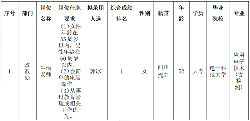 绵阳中学实验学校关于招聘生活老师岗位拟录用人员的公示(第二批)