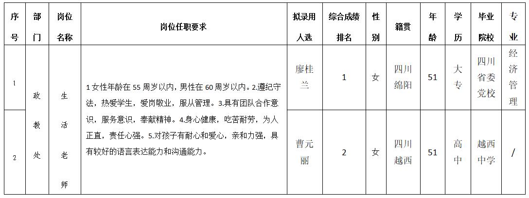 根据绵阳中学实验学校发布的招聘公告及招聘相关规定,经面试、考察、体检等程序,拟录用廖桂兰等2名同志到绵阳中学实验学校工作。现予以公示,具体情况如下: