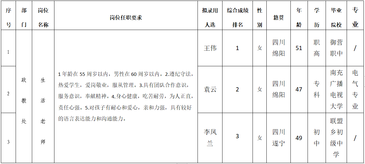 绵阳中学实验学校2023年生活老师等岗位 招聘员工拟录用人员公示