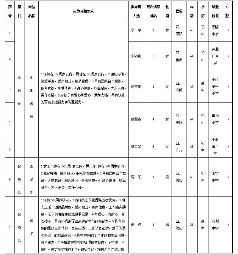 绵阳中学实验学校2023年生活老师等岗位 招聘员工拟录用人员公示