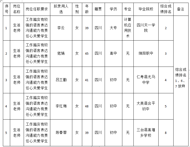 绵阳南山中学实验学校生活老师拟聘用人员结果公示(第一批)