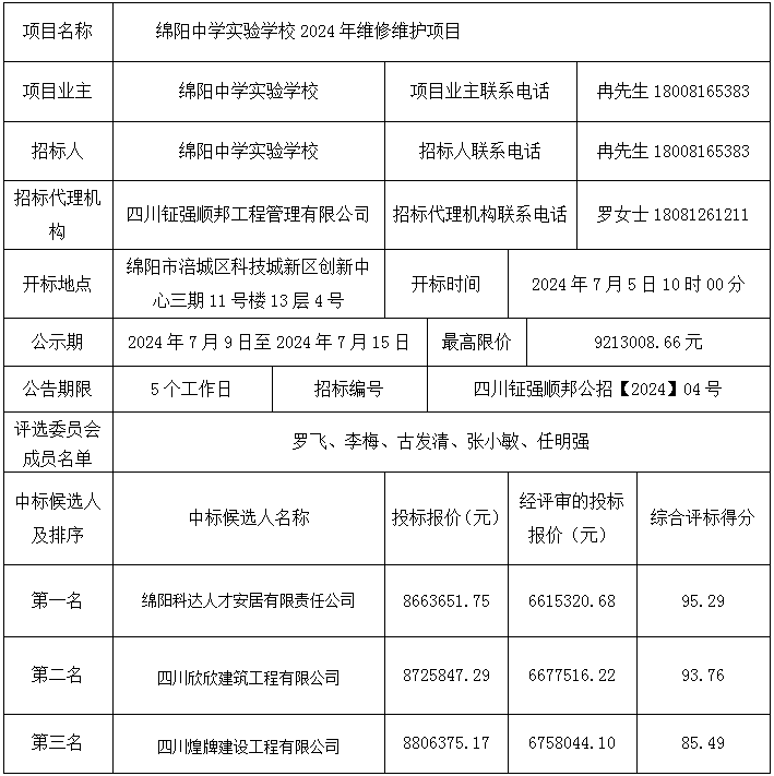 “绵阳中学实验学校2024年维修维护项目”评审结果公示