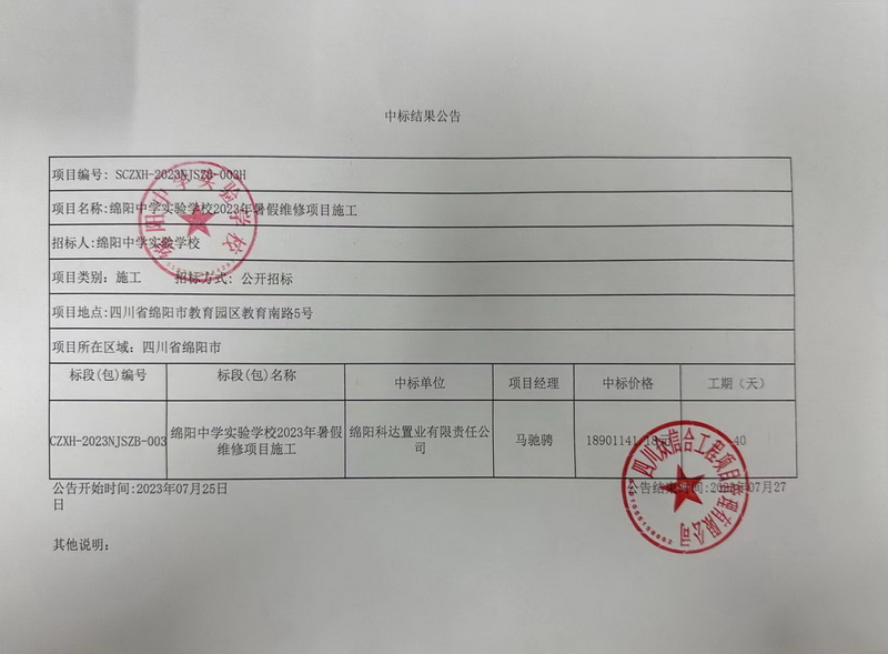 绵阳中学实验学校2023年暑假维修项目施工中标结果公示