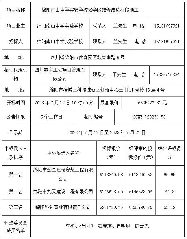 “绵阳南山中学实验学校教学区维修改造标段施工”评审结果公示