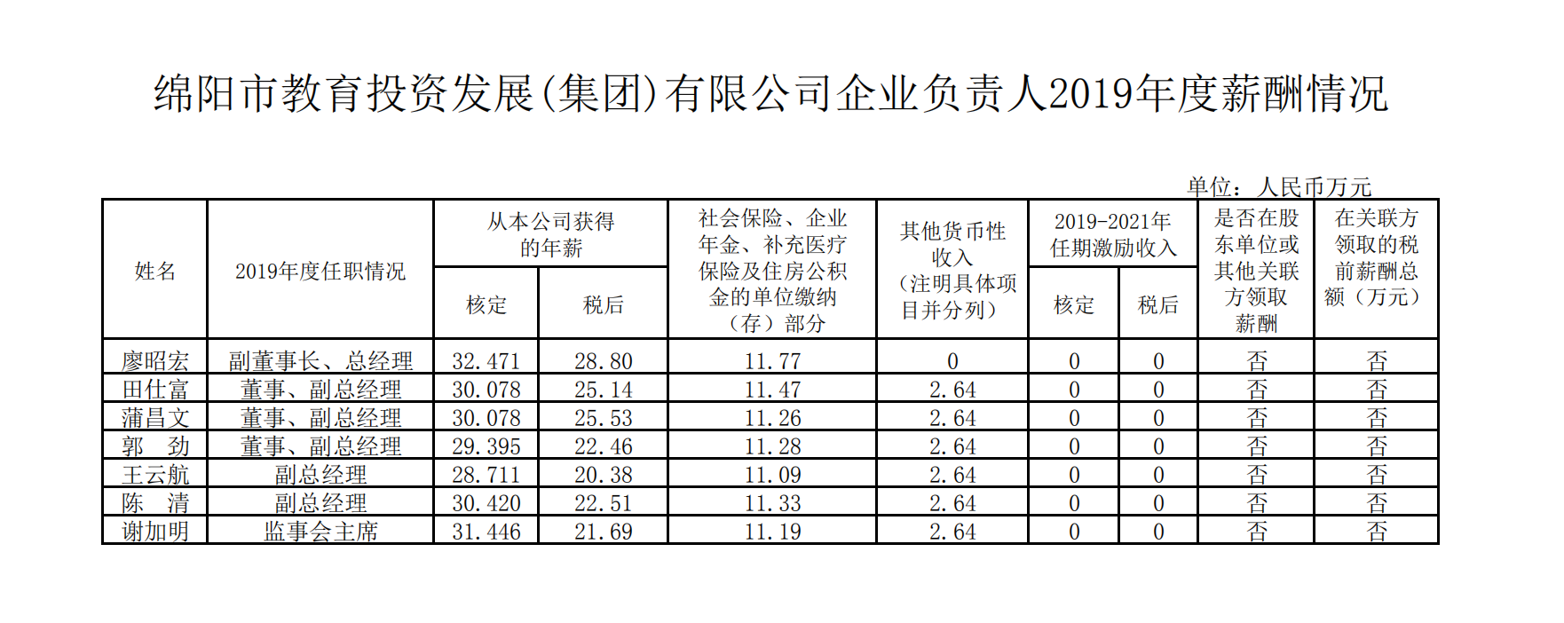 绵阳市教育投资发展(集团)有限公司企业负责人2019年度薪酬情况