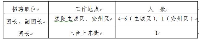 2020年公司将新增7所幼儿园,教师子女可优先就读教投公司旗下学校(绵阳外国语实验学校、绵阳中学实验学校、南山中学实验学校)。根据公司发展需求,特面向省内外公开招聘幼儿园园长、副园长等职位。有关招聘事项公告如下: