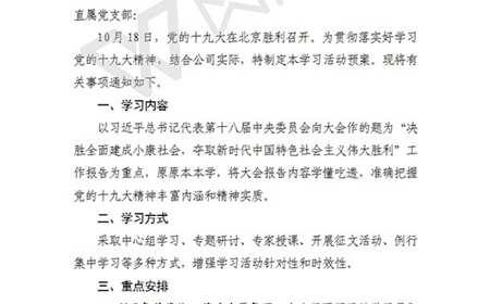 10月18日,举世瞩目的中国共产党第十九次全国代表大会在北京人民大会堂隆重召开,习近平总书记代表第十八届中央委员会向大会作了题为“决胜全面建成小康社会,夺取新时代中国特色社会主义伟大胜利”工作报告。为深入学习宣传贯彻十九大精神,进一步将学习活动引向深入,公司党总支及时研究印发了“关于开展学习贯彻党的十九大精神的通知”,制定了学习活动预案,确定了重点学习内容,明确了中心组学习、专题研讨、专家授课、开...